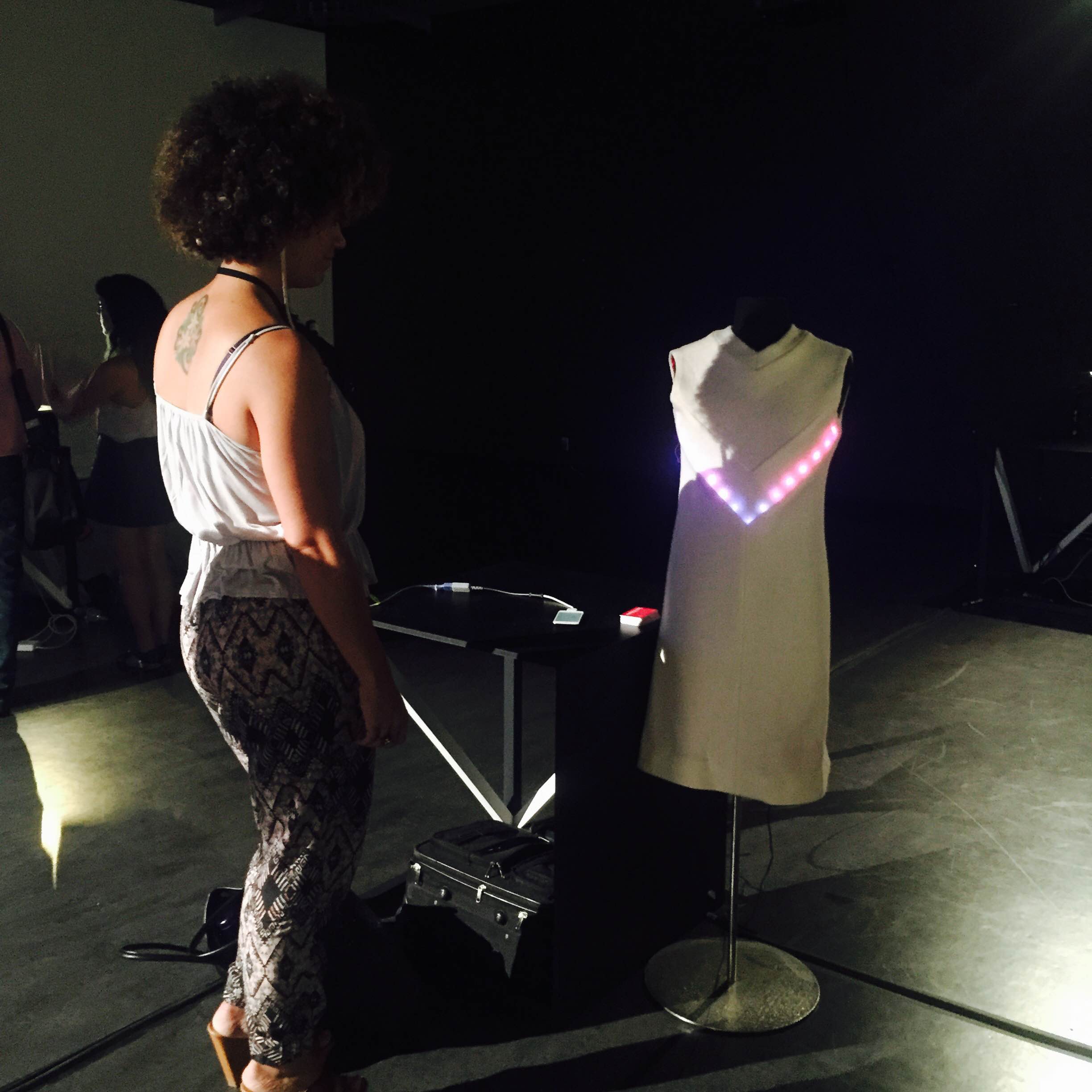The electrical charge of this “overdress” creates little light flashes across the dress that my iPhone camera can’t capture. On the mannequin, a programmed array of flashes runs. We have to imagine the shocks.