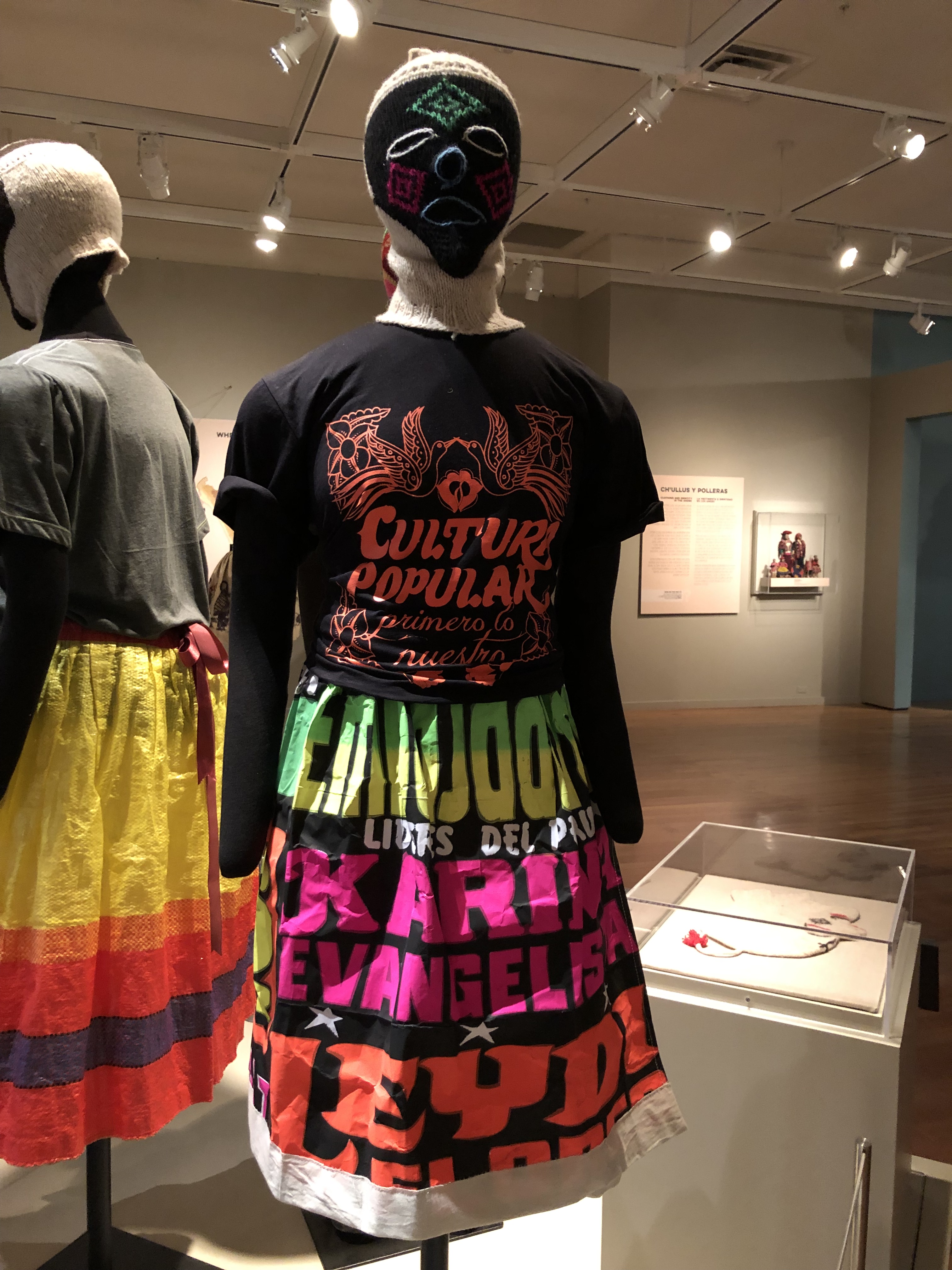 An example is the exhibition, “Crafting Memory: The Art of Community in Peru,” which focuses on the plight of migrants: people forced for economic. political, or environmental reasons to leave their ancestral communities and who are denigrated in the city. For example, the signature Peruvian wool hat called the chulla and the full skirts called polleras typify traditional dress that stigmatized their wearers, who were derided as “chola” or “cholo,” an ethnic slur. Qarla Quispe, a young artist working in Lima, creates defiant polleras from potato sacks or prints with contemporary graphics to tell the stories of the wearer’s family. She is part of a movement of artists who mix old cultural traditions with new. They are paired in the museum with T-shirts by Peruvian