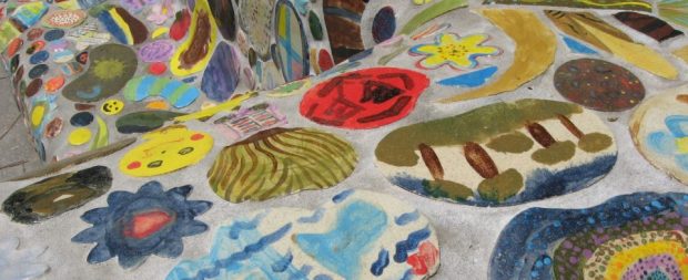 The third header (if visible) is a detail of a tile banco at James H. Rodriguez Elementary School, Española (2010) by Abiquiu artist Sabra Moore.